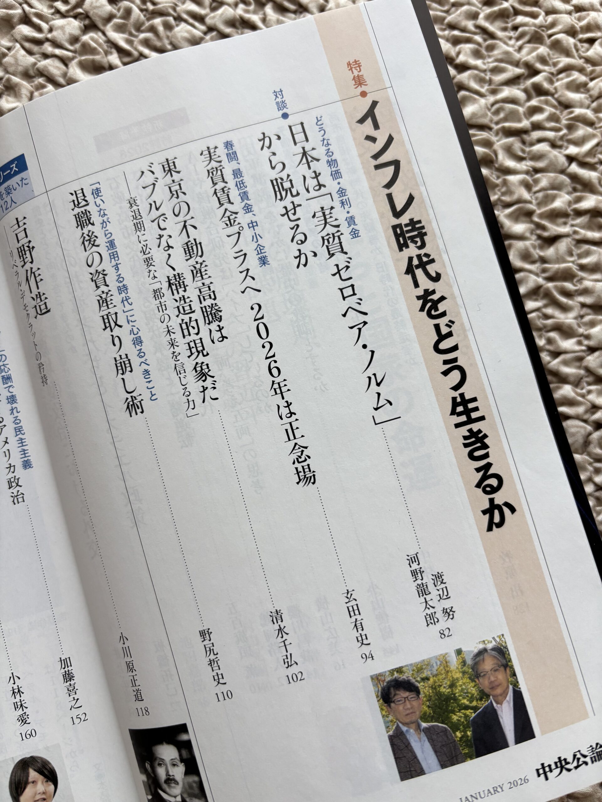 2025年12月12日 / 最終更新日時 : 2025年12月12日 finwell-wp-admin 著書コラム 中央公論26年1月号に寄稿 中央公論2026年1月号に特集「インフレ時代にどう生きるか」に「退職後の資産取り崩し術」と題して8ページの寄稿をさせていただきました。かなり網羅的に必要な事項をまとめていますので、ご一読いただくには俯瞰できる内容になっていると自負しています。ところでこれまでにこうしたタイプの雑誌で「取り崩し」が扱われたことはなかったと思います。少しずつ資産取り崩しが広まってきたのでしょうか。うれしいことです。 FacebookXBlueskyHatenaCopy