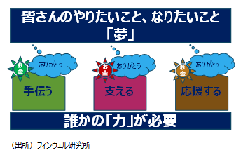 また皆さんの夢を叶えるのは何のためかを考えてみてください。皆さんの夢が何かに貢献したい、誰かのために役立ちたいということは、皆さんの夢そのものが、誰かの夢を実現するための支える力になっているかもしれません。地元に観光客を増やすことで地元の人たちが豊かになる、支援をすることで障害者の人たちが楽しく生活できるようになること、お金のチカラが実現の橋渡しをしてくれるはずです。さらにそうした思いをお金に託して、夢を実現するための支援の力に変えることもできます。