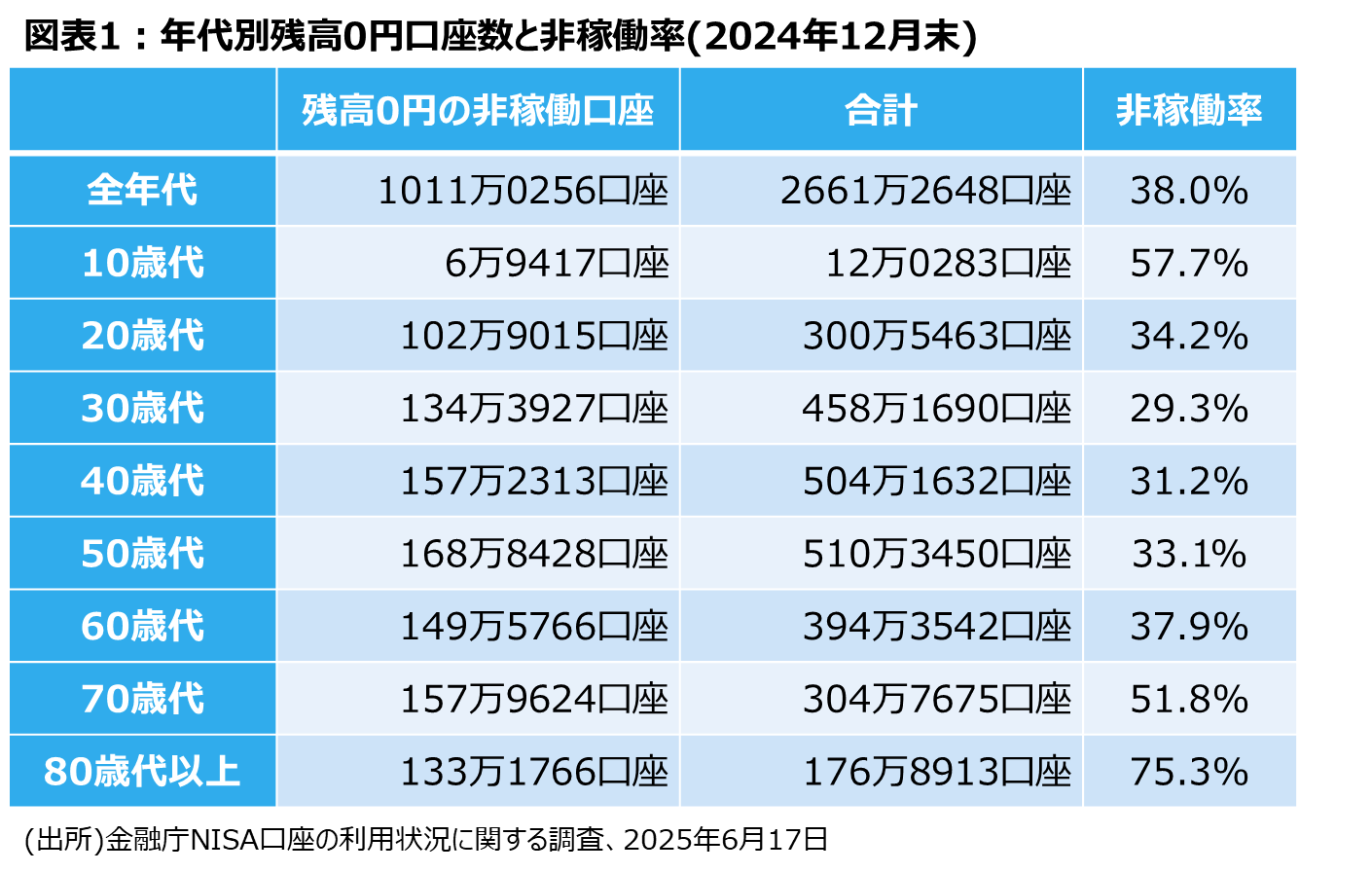 新NISAでも非稼働口座がかなり多くあります。24年末のデータでは、残高0円の非稼働口座は全体で1011万口座に達し、全口座の38.0%を占めています。