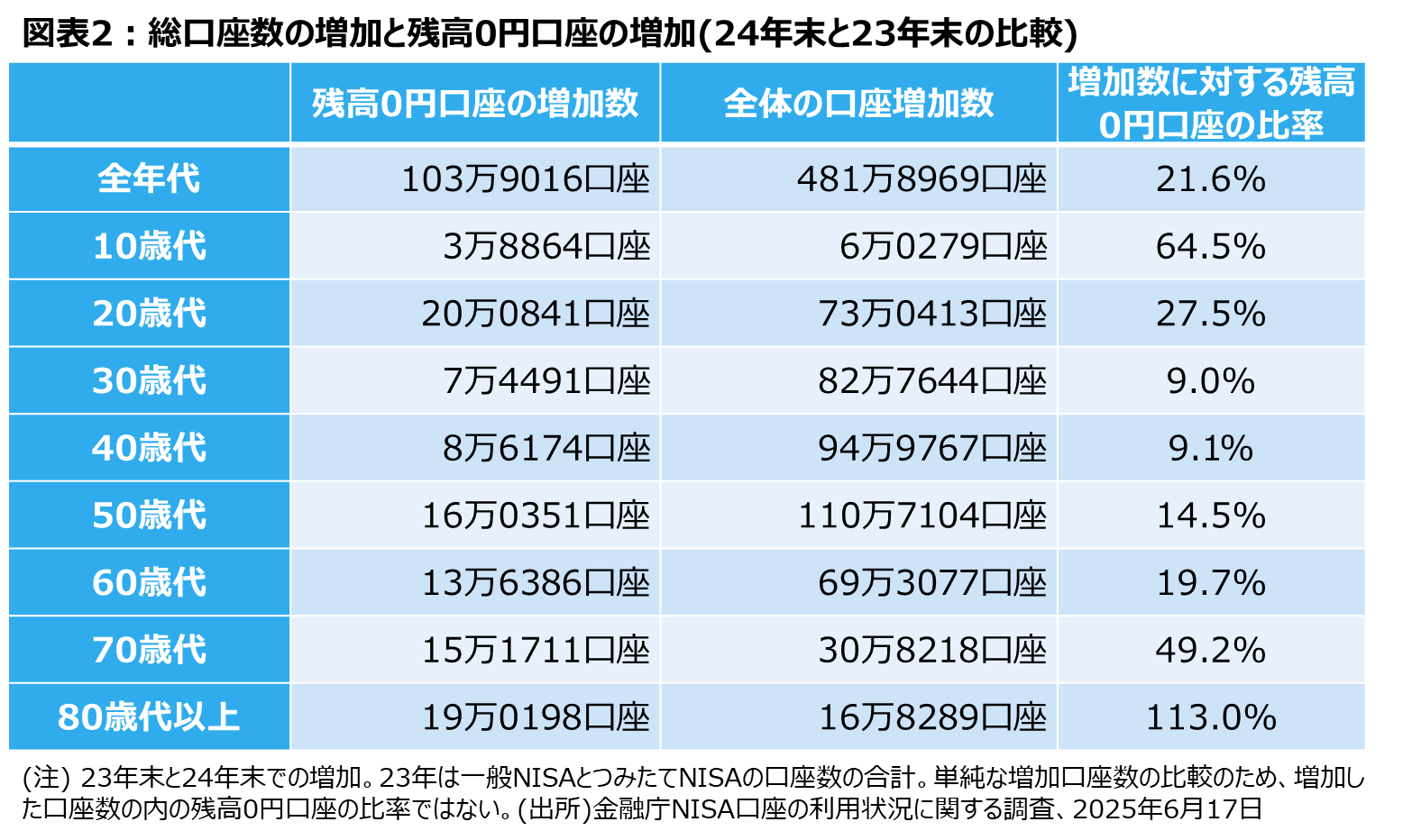 まずは、非稼働口座の状況から、高齢層が十分に新NISAを使っていない状況をみておきます。改めて24年末におけるNISAの残高0円口座の動向を紹介します。なお、金融庁の利用状況調査の表には、脚注として、『「0円」欄に記載の各口座数は、2024年1月1日~12月31日中に一度も買付がなかった口座数』と記載されています。旧NISAから新NISAへ資金の移管ができないことからすると、買付がないことは、その口座には一度も残高がなかったということになります。ここではこれを非稼働口座と呼ぶことにします。