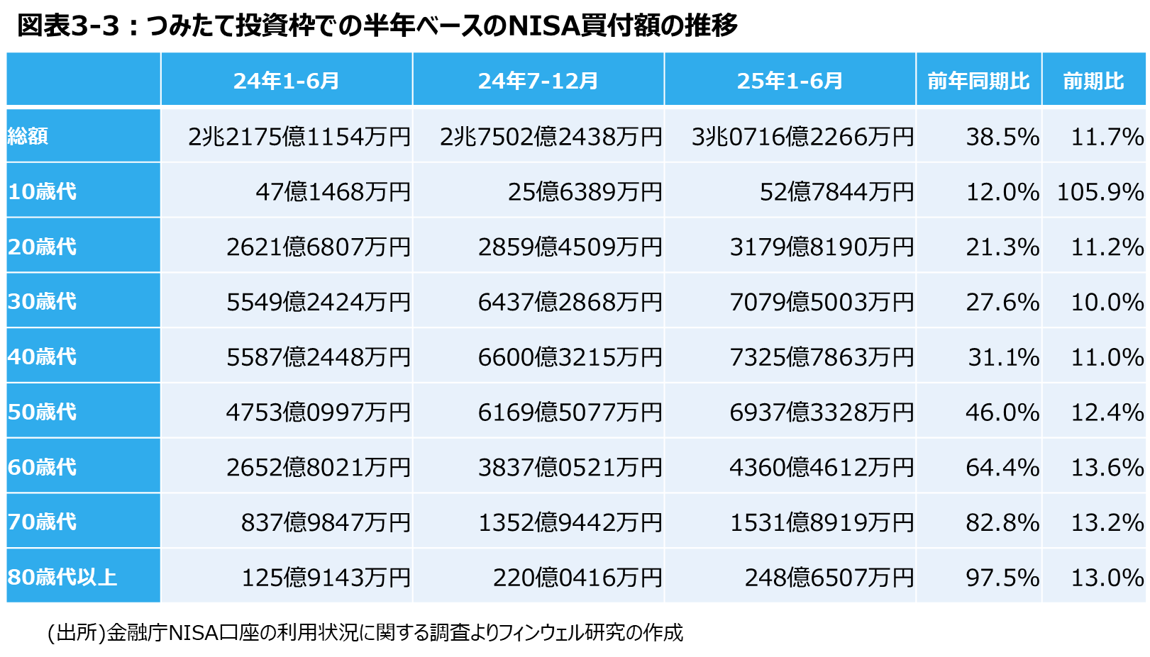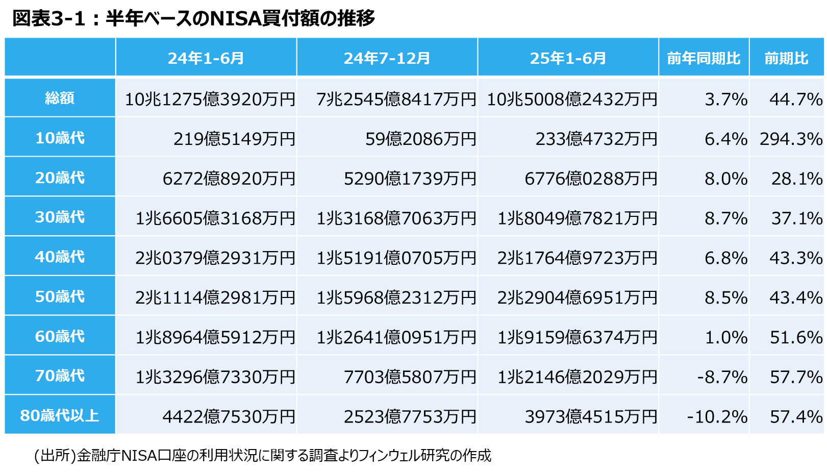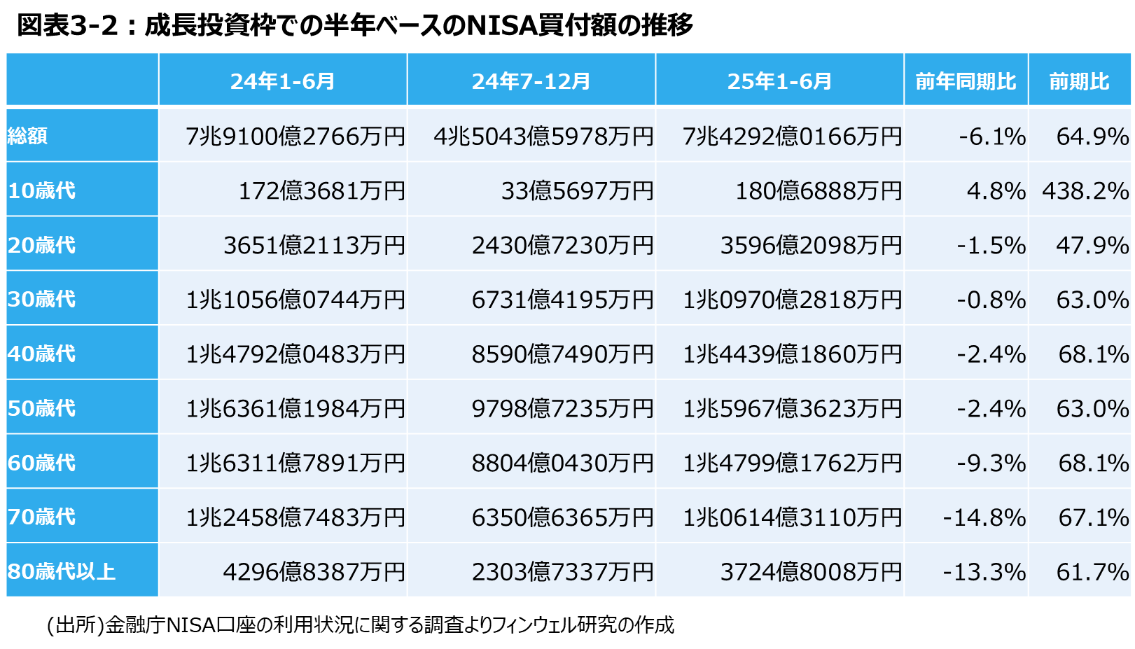 25年1‐6月の買付額のデータでは、特に高齢層で新NISAを経由した投資がそれほど伸びていないという点が気になります。