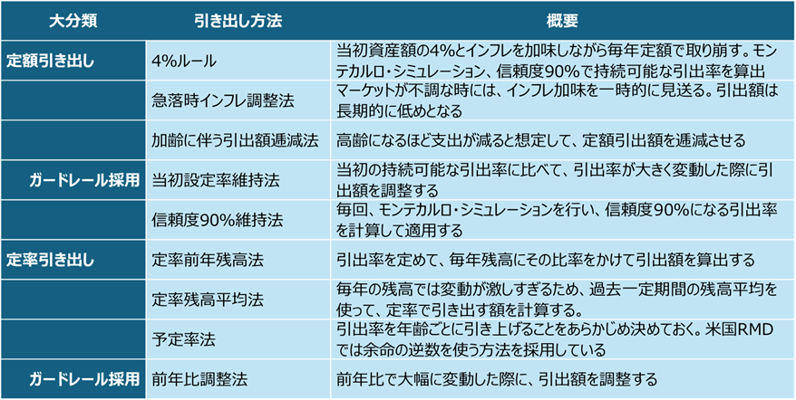 ここでは、この2つの方法を軸にして、その改良版とそれぞれが持っている意味、目的を整理してみます。取り崩し(Decumulation)に関しては、日本より米国での議論が進んでいますので、昨年12月にリリースされたMorningstar社「The State of Retirement Income:2025」で言及しているポイントも加えて考えます。