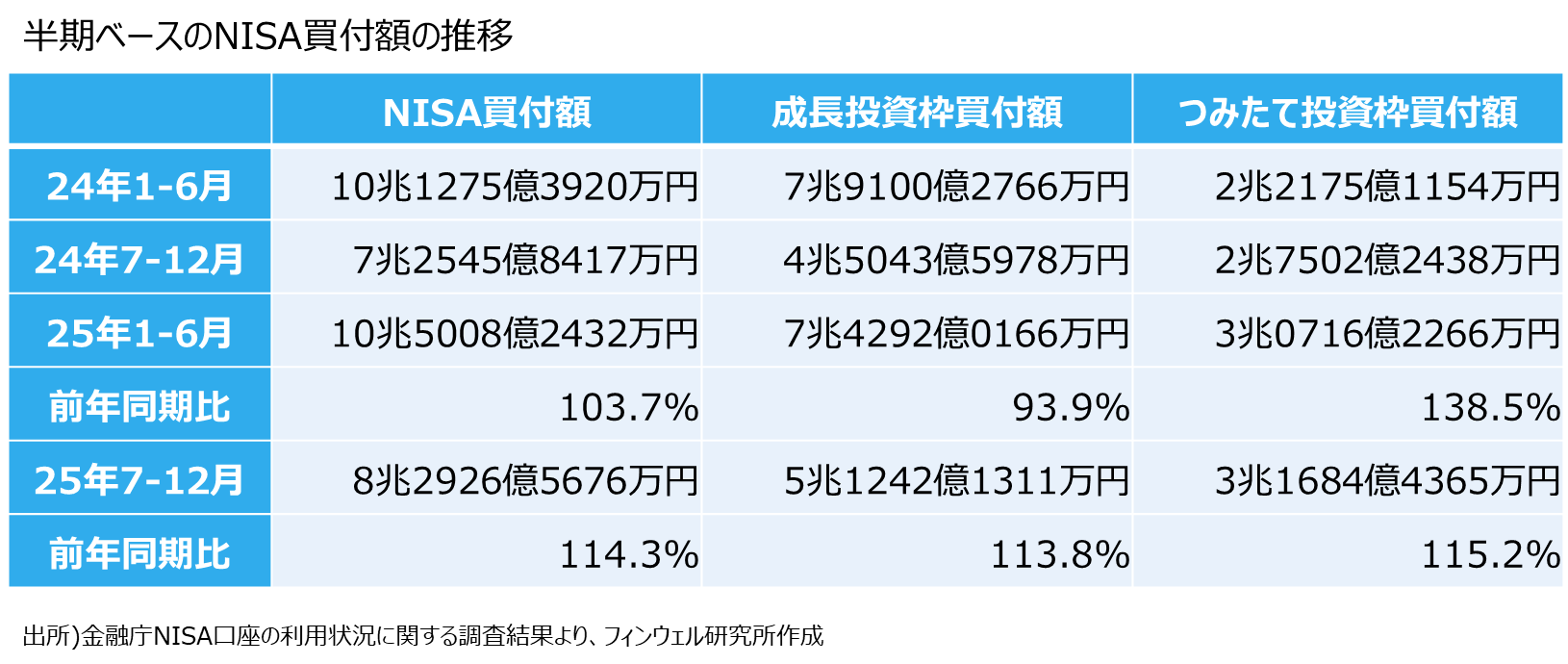 そのため成長投資枠の場合は、前年同期比でみる必要があります。25年では、前半は前年同期比でマイナス6.1%と減少し、後半は前年同期比で13.8%増と急増しています。前半はトランプ関税などの波乱要因があり、後半は株価の急騰が影響していると思われます。