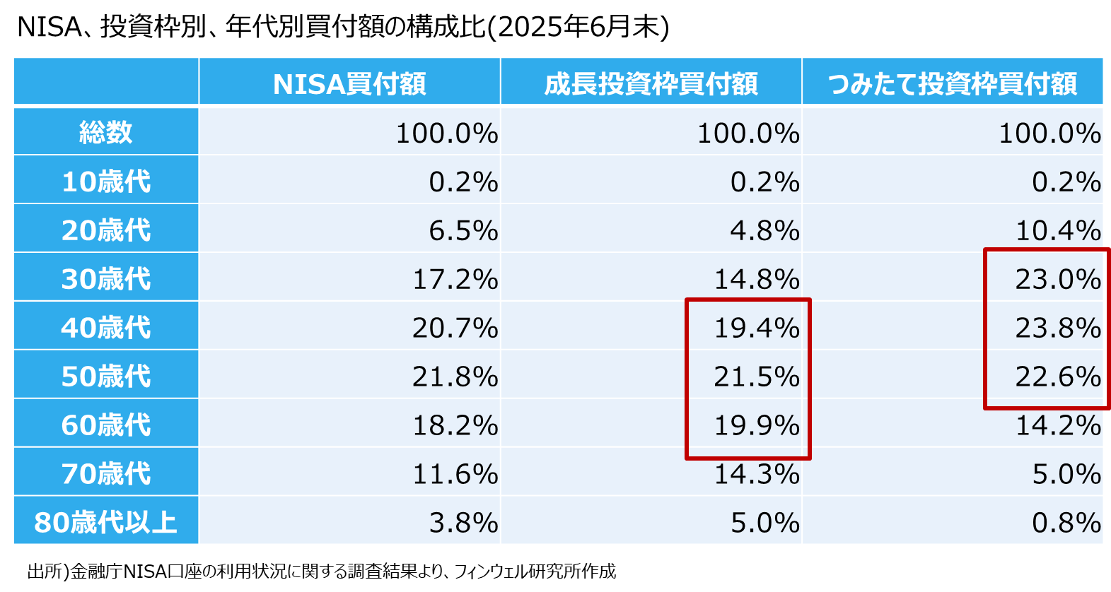 成長投資枠の変動は、日本株の買付が多いことの他に、年代別の特徴も反映している可能性があります。投資額を年代別にみると、つみたて投資枠が若年層で、成長投資枠は中堅から高齢層という特徴もあります。金融庁から公表されている年代別の投資額の分布は、直近データで2025年6月末ですが、それによると、成長投資枠での買付額では50代が21.5%、60代が19.9%です。つみたて投資枠の30代23.0%、40代23.8%、50代22.6%と比べると、中核層の年齢が高いことが分かります。