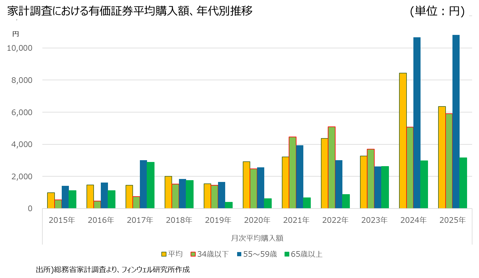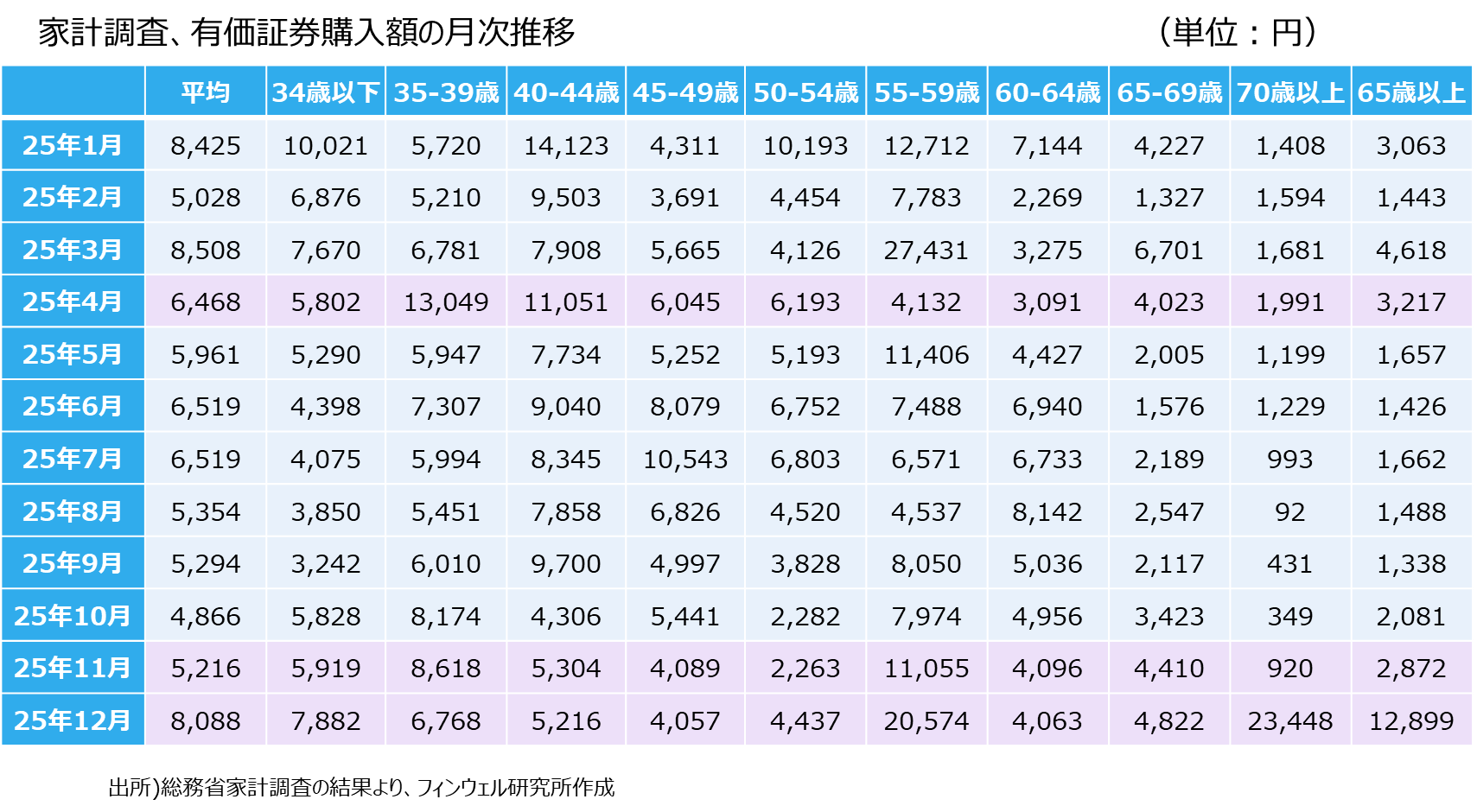2025年の投資動向をもう少し細かく見るために、家計調査から月次の年代別有価証券購入額の動きをみてみます。2025年は春と年末に特徴がありました。4月はトランプ関税の影響から相場が急落していますが、その前後に大きく購入額を増やしたのが、35-39歳、40-44歳、そして55-59歳の層です。相場の急落時に積極的に買いに出たような動きです。
