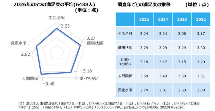 ウェルビーイングの議論でよく使われるGallup社の定義を参考に、退職者向けに生活全般の満足度は、健康水準の満足度、仕事・やりがいの満足度、人間関係の満足度、資産水準の満足度の4つで構成されると考えて、「60代6000人の声」アンケート調査では5つの満足度を毎回聞いています。