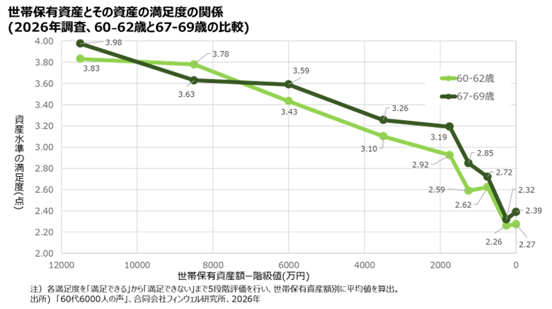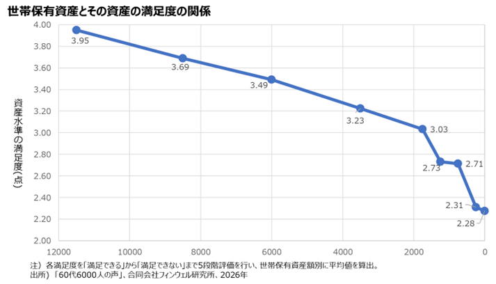 グラフは、世帯資産水準のレンジごとに資産水準の満足度の平均値をとってプロットしています。資産が1億円を超える世帯ではその満足度は4点にかなり近いところにありますが、6000万円になると4点を下回り、2000万円を下回ると一段と満足度が低下することがわかります。これを資産水準の満足度曲線と呼ぶことにしています。