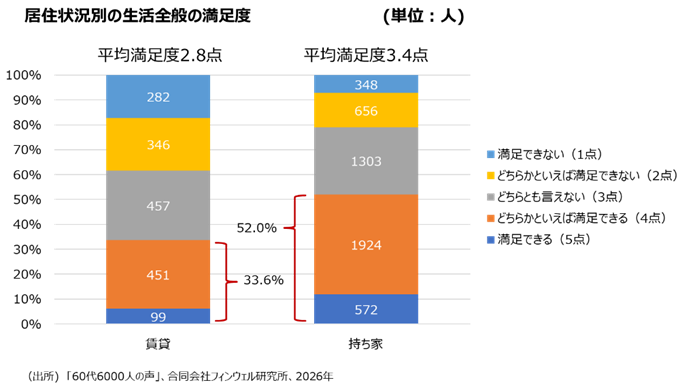 今回の調査では持ち家に住んでいる60代が74.6%に達しており、居住状態別に生活全般の満足度を集計しました。結果は、持ち家生活者の生活全般の満足度は、「どちらかといえば満足できる(=4点)」と「満足できる(=5点)」が全体の52%と過半を占め、平均満足度は3.4点となりました。これは賃貸生活者の2.8点と比べてかなり高い水準です。