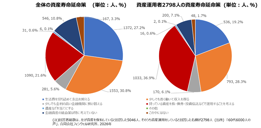ちなみに資産運用を行っている人だけを抽出して同様の上位3策の昨年との変化をみると、「長く働くこと」が30.8%から28.3%に、「節約」も22.6%から19.2%に低下しています。一方で、「資産運用」は32.9%から36.9%へと上昇していますので、全体の傾向と同じといえます。ただ、それでも資産運用を行っている人の3分の1しか資産寿命の延伸を目的に挙げておらず、まだ多数派にはなっていません。